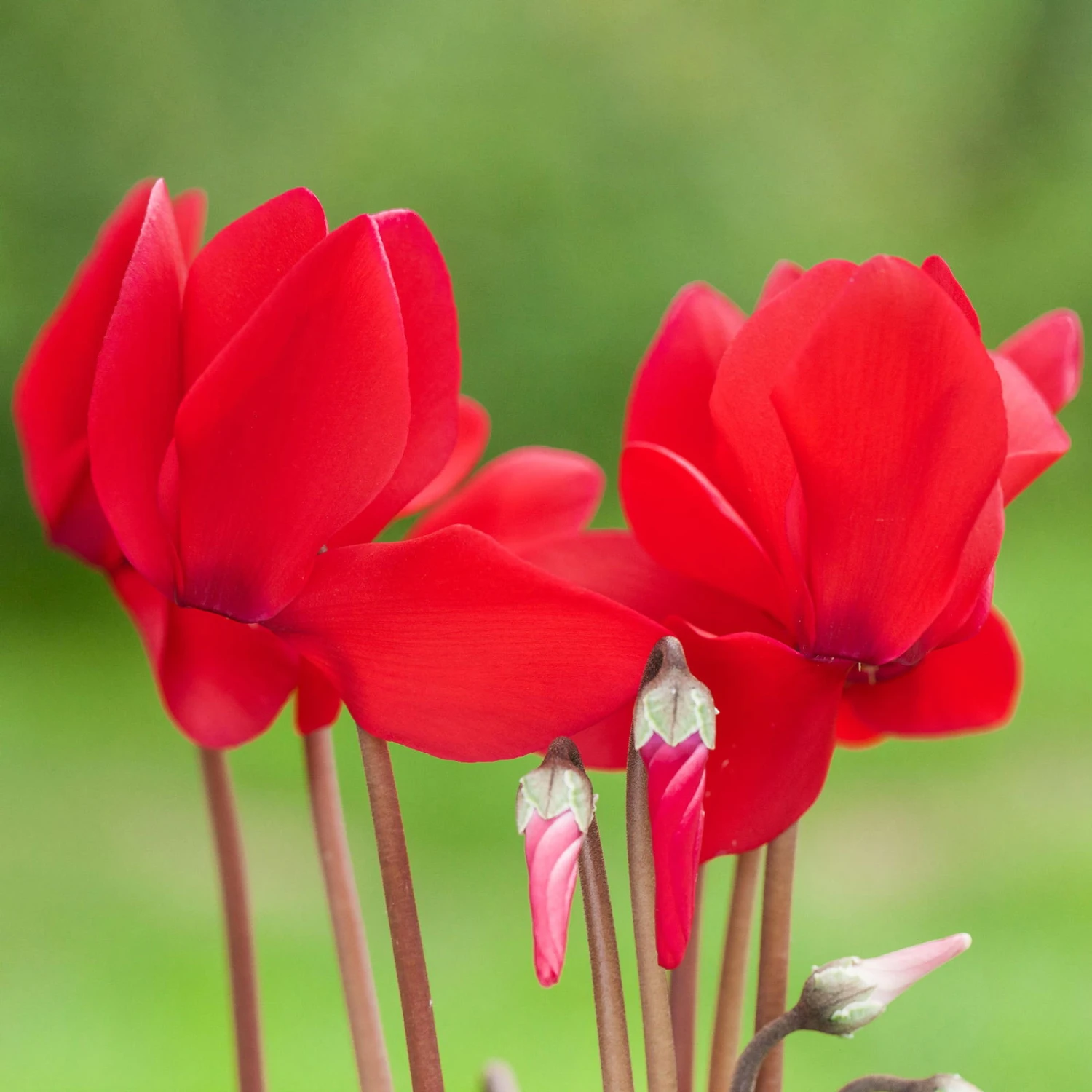 Die Blüten des Alpenveilchens sind je nach Sorte glattrandig bis gefranst und sitzen an langen Stielen oberhalb der Blätter. Die Blütezeit beginnt ab September und reicht bis in den April hinein.