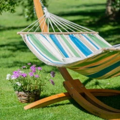 Diese Single Stabhängematte mit Gestell ist ein Highlight in jedem Garten. In den Farben Grün, Beige und Blau sieht sie einladend aus. Sie hat die Maße 120 x 320 x 100 cm und ein Gestell aus Lärche, das durch eine spezielle Imprägnierung wetterfest ist. Der Stoff ist ebenfalls unempfindlich und pflegeleicht. Die Hängematte ist bis zu 120 kg belastbar.